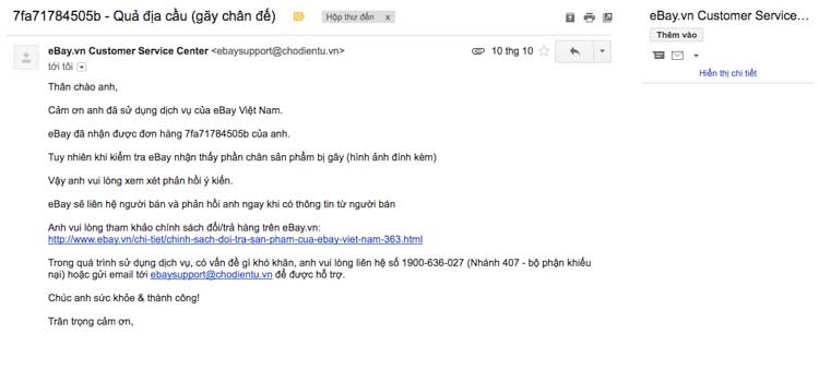 Tới ngày 10/10, mình nhận thông báo hàng đã về nhưng khi mở hàng kiểm tra tại kho Ebay VN thì họ báo lại là hàng bị gãy chân đế (không biết nguyên nhân do đâu) và gửi mình hình ảnh sản phẩm bị hỏng qua email. Nếu vẫn chấp nhận, mình phải trả thêm 600 ngàn tiền vận chuyển để lấy hàng về nhà.