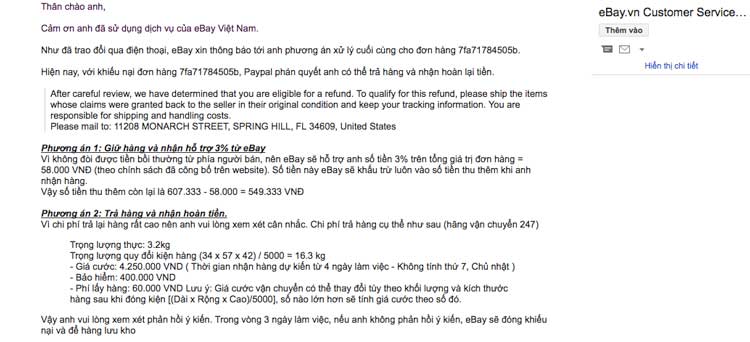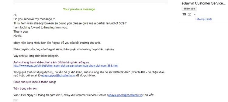 Đến tận 31/10, họ mail cho mình và nói rằng "Ebay đã liên hệ người bán yêu cầu họ bồi thường cho anh, tuy nhiên người bán phản hồi không đồng ý vì đã quá thời gian xử lý của họ". Sau đó, họ nói đang khiếu nại lên Paypal và nói rằng phán quyết của Paypal sẽ là phán quyết cuối cùng cho trường hợp của mình.